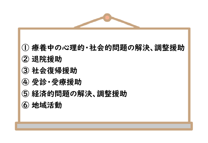 もう少しかみ砕いて仕事内容を説明するよ。例えば①の部分だと、「病気で入院することになった。働けないから、金銭面に不安がある。」っていう相談がきたとするよね。そうしたら、患者さんのお話を傾聴して、まずは治療を続けながら仕事を両立する方法を探り、傷病手当金をはじめとする制度が活用できるか相談しながら問題解決にむけた支援をおこなっているよ。