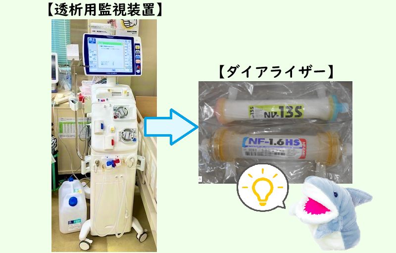 まず「透析用監視装置」は、血液透析治療を受けるときに使用するよ。この装置は、機能が低下した腎臓に代わって、生命維持に欠かせない血液の浄化を行うんだ。この血液の浄化を行うときに「ダイアライザー」を使用するんだ。